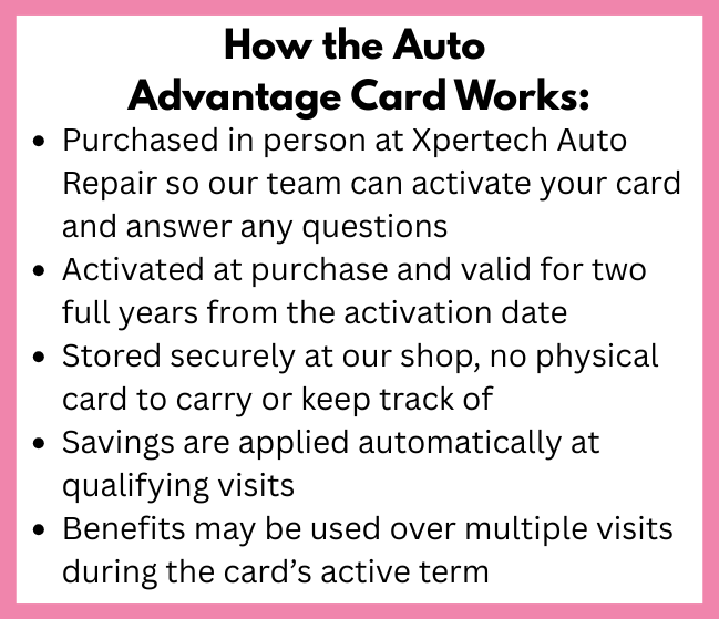 Available exclusively at Xpertech Auto Repair, the Auto Advantage Card is a prepaid savings